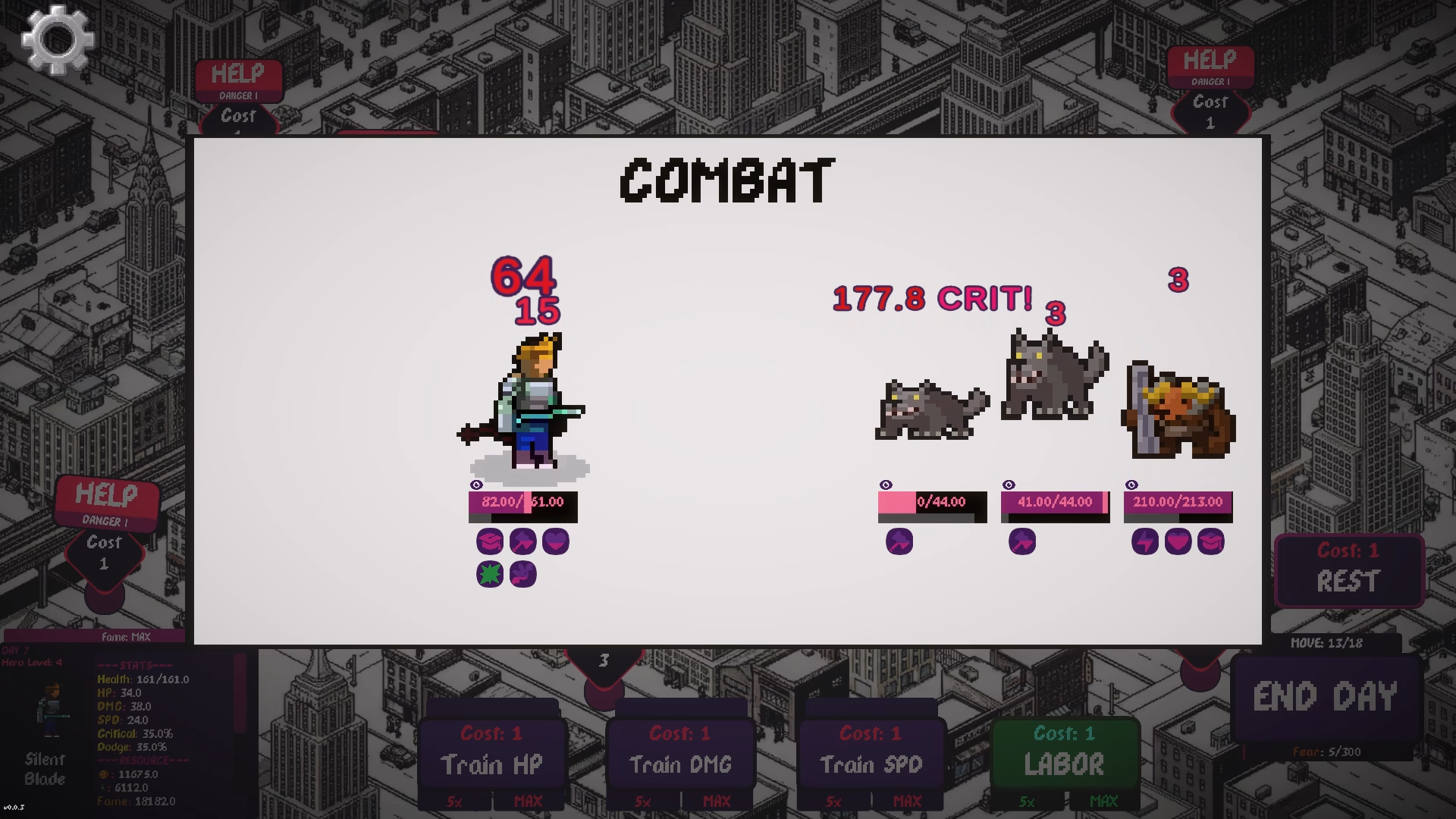 Thank you! I couldn't test the game enough during game jam so current balance is not good. As you said, giving % stats from tree and flat ones during training could be better. Fame requirement is also nice, some of critical upgrades may be unlocked with this. For the labor spamming part, I think there may be some penalty if you pass Help encounters, they may reduce your fame if you skip them. As you are more hero, you will get more responsibility and people believe in you so breaking that promise should be bad. Encounter count also can be increased with fame instead of from skill tree.