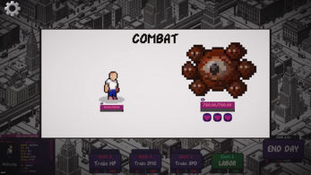 You don't start with a sword of destiny. You start with debt and ambition. Every day is a resource. Balance your daily actions between Training your stats (HP, Damage, Speed) and Laboring to earn the cash needed to survive.